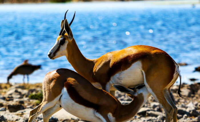 Nel parco Nazionale Etosha i branchi d’animali si muovono liberamente come fanno dagli albori del mondo; l’’Etosha ospita 14 ambienti vegetali, 50 specie di serpenti, 114 specie di mammiferi e 340 specie di uccelli, sia dotati della capacità di volare, come i fenicotteri e le gru coronate, che, arrivando sull’ acqua, che riempie la depressione nella stagione delle piogge, perché attirati dalle alghe blu – verdi, sono protagonisti di uno scenario che lascerebbe tutti a bocca aperta, sia però anche un’ immensa quantità di struzzi, e troviamo anche l’otarda di Kori, il volatile più pesante al mondo.
